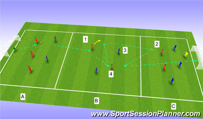 Two teams of 8,arranged in three areas of pitch as shown.Players in Area A receive ball off goalkeeper and attempt to play through to players in area B.
