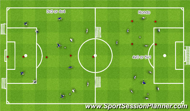 Organization: For a game, set up small sided fields that are approximately 30x40, 4v4, max! For the rondo, play 4v0, with a player sitting out. If a player on the inside makes a mistake, sub that player out. In the 5v1, switch the middle player every time there's a mistake.