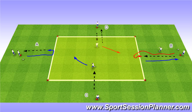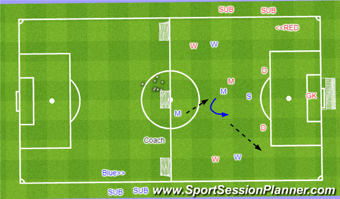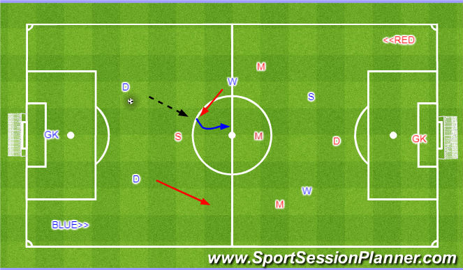 Organization: In a reduced 7v7 field play 5v6. The Blue team will play in a 0-0-2-3 formation and the Red team will play in a 1-2-3 formation. Balls start from the blue midfield.