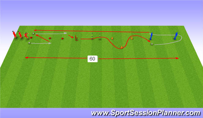 Sprints back to start line and picks up 2nd ball and leaves on 2nd cone(15yds)