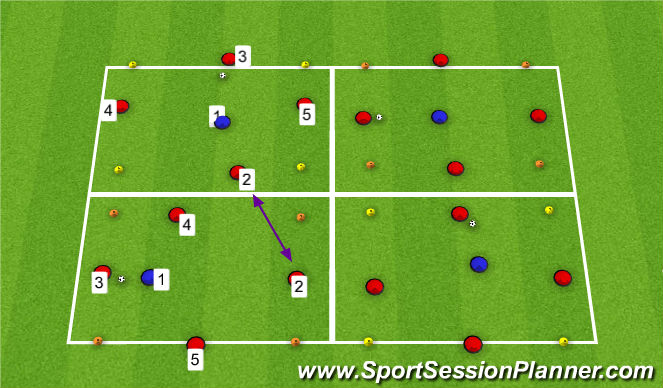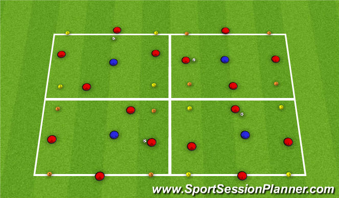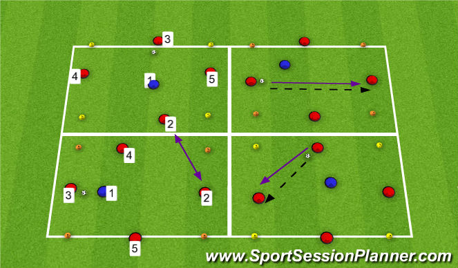 Players are now passing the ball and moving in their grids. When the coach calls a number, that players has to move to the other grid. The group that keeps the ball the longest gets a point. When the ball goes out, that group is eliminate from this round.