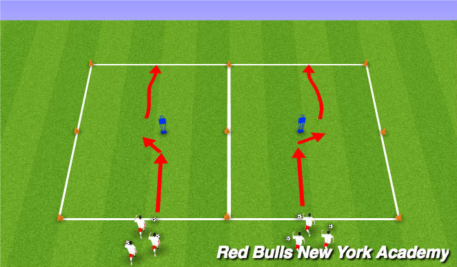 - Players dribble to either cone on the middle line and perform their double move (Inside / Scissors).
