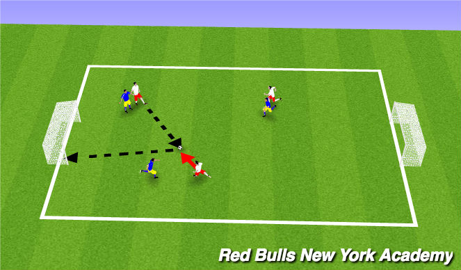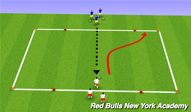 - Teams take it in turns to try and score (dribbling through end zone) as soon as ball goes out or player scores, next pair goes.