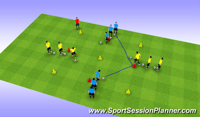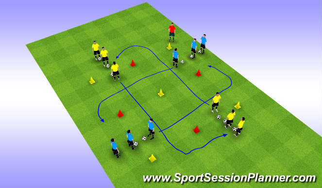 Zelfde als de basisvorm, alle spelers starten met dribbelen tot dat ze halverwege het eerste vierkant zijn. Op dat moment stoppen ze de bal en rennen naar de bal die voor hen ligt (gestopt door een andere speler). Vervolgens dribbelen ze verder met deze bal.