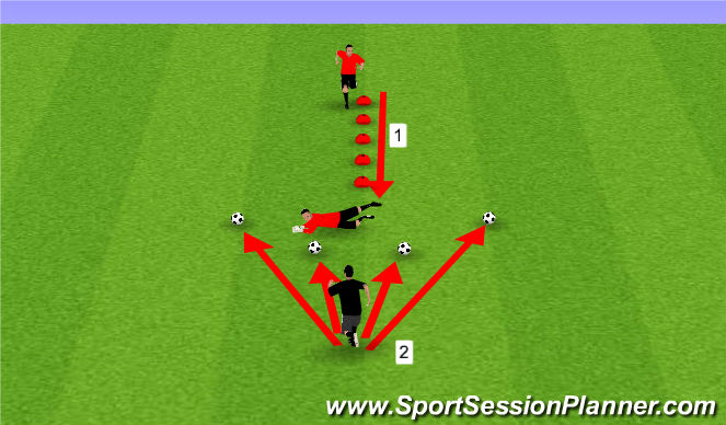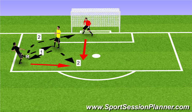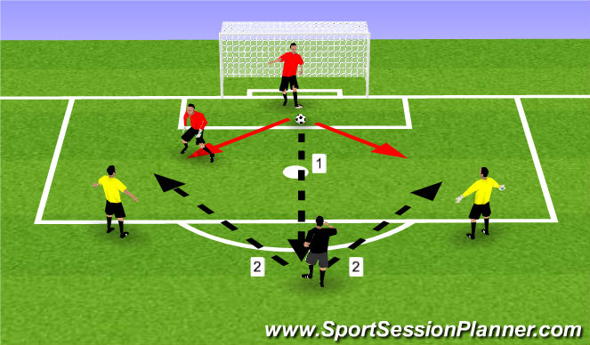2.El EP puede lanzar a portería directamente o bien el portero de apoyo puede dar un pase hacia el centro en el que el portero rojo debe tratar de achicar espacios o anticiparse a la acción del delantero.