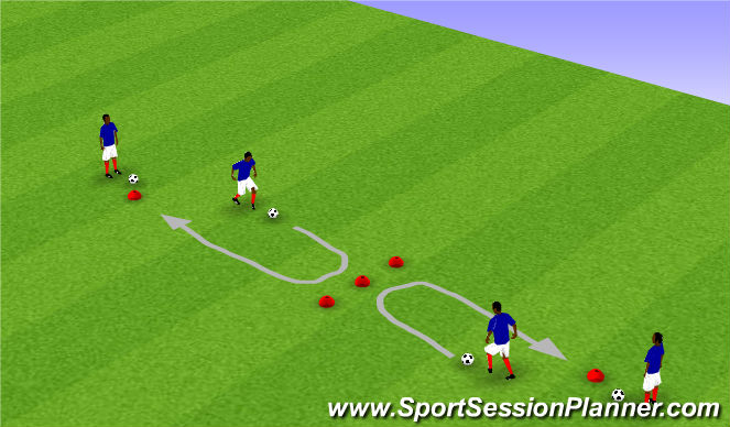Set up cones 20 yards apart. In the middle make a row of three cones or a diamond shape. Have two players at each end all with a ball. The players dribble towards each other and when they reach the central cones perform the same TURNING move and continue back to the cone they started from. Skills: Inside Chop, Outside Chop, Pullback, ½ Zico, Full Zico (NEW)