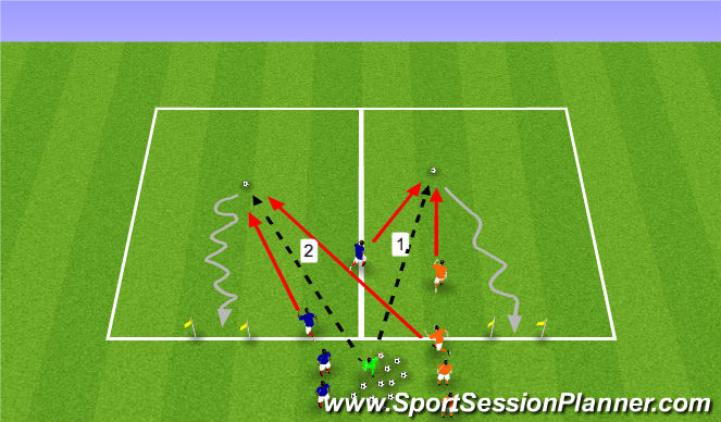 Set up two fields 15x20 side by side that share a common middle touch-line. There is only one gate or goal on each field. The balls start with the coach who is at the center between the fields on the end line. The coach will play a ball into one of the fields, then the first player in each line will go after the ball and play 1v1 to the gate on that field. Simultaneously, a separate game can be happening on the opposite field. The players must be paying attention as to what field is open, which field the ball gets played to, and which goal to score on. As soon as one of the fields is done (goal scored or out of bounds) the coach will play a new ball into the open field for two new players. Encourage good use of skills learned and proper turns to keep the ball away from their opponent. Praise good use of previous skills learned to speed dribble and penetrate in addition to dribbling to protect the ball.