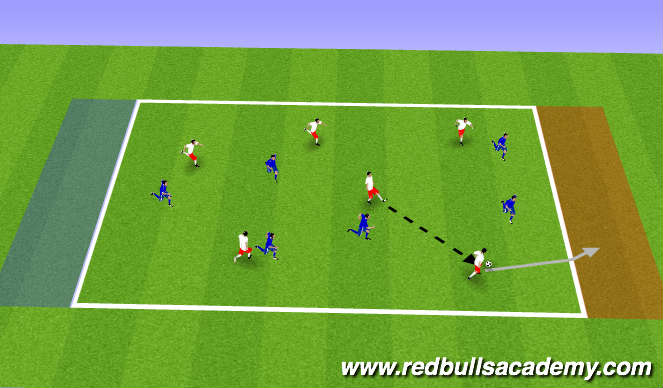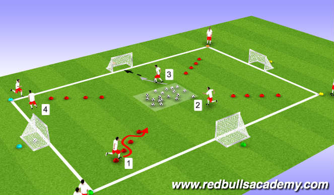 - 3: Dribble and shoot in the goal to the right of your team (each team has a colored cone behind their goal) e.g the yellow team will score in the goal with the yellow cone behind.