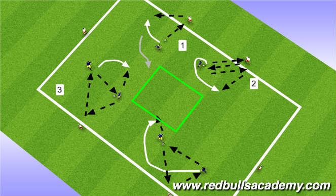 - Players on inside look to play players on outside, open up receive, find new player on outside (when in singles perform move in green square after receiving, before finding next outside pass)