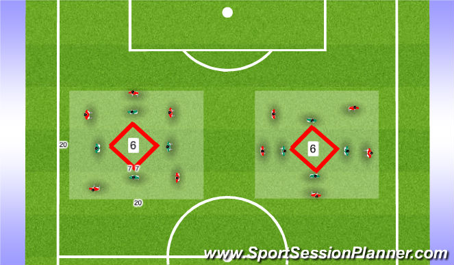 Description: Ball will start from alternating red CBs. The high midfielder will depend on which side is receiving the ball first. This starting position will be pre-set before each rotation. Reds try to find any of the attacking pug goals. 6 cannot leave the diamond but also cannot be defended against until ball crosses one of the lines of diamond. Reds score double if they connect through the 6 first.