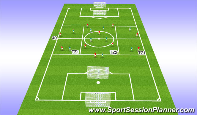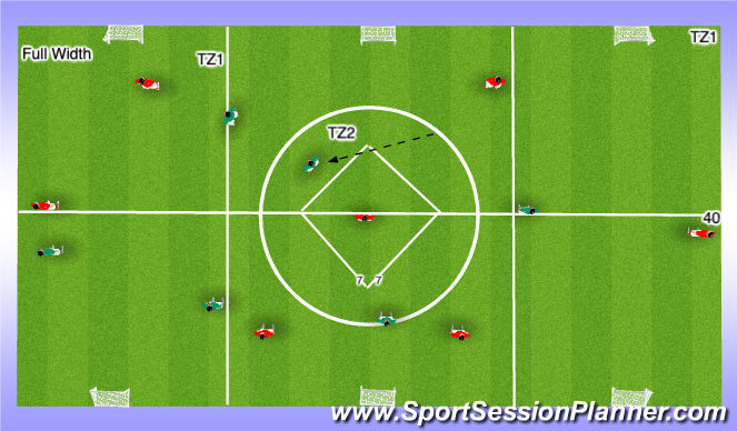 Coaching points: Greens ceate defensive overloads in TZ1 initially and negative press into TZ2 if beaten centrally. Deny forward pentration at all times.