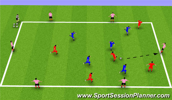 The Red and Blue teams play a 5v5 possession game in the 35x25 grid. 6 neutral players in Pink pinnies are stationed around the outside and can be used as frequently as necessary. Coach is observing from the side with a supply of balls ready to keep the game moving.