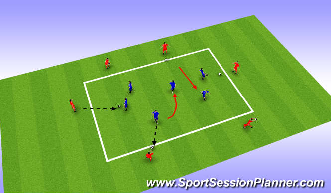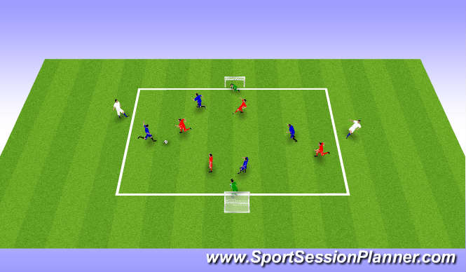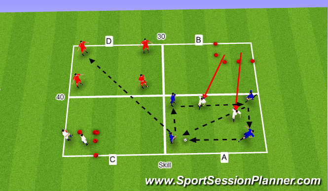 Organisation:The area is 30 x 40 and split into 4 giving each box a 15 x 20 area, Start with 3 teams of 4, Putting a Blue team in box A and Reds in box D while spliting the 3rd team Whites into smaller area 5x5 made in box B & C. The ball starts in box A, and as soon as first player touches the ball, The 2 players from box B are released to win the ball back creating a 4v2 game in box A. The blues aim is to make 3 Consecutive passes without letting the Whites touch the ball, Then they can Switch the ball to box D on switching the ball, the 2 Whites will return to their corner, And this releases the 2 whites in box C to attack the Reds, Reds are to do the same then return ball to Blues, this continues untill a white wins the ball, or a teams loses possesion. Which ever team the whites gain the ball off, they now take thier place in thier box, and the team that lost the ball now have to split and enter box B & C. defenders cannot leave thier box untill their team mates have got back to thiers.