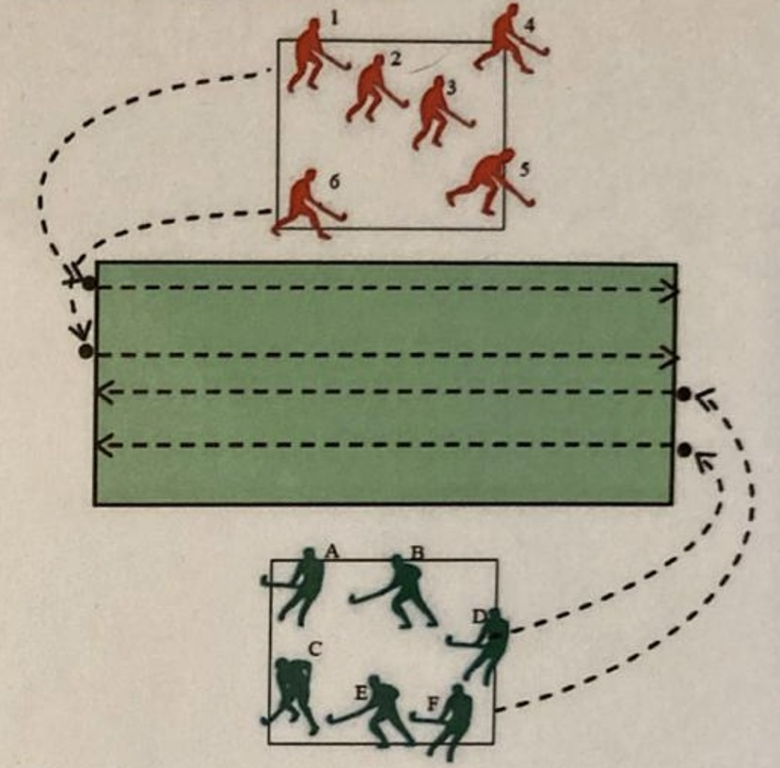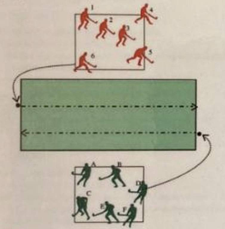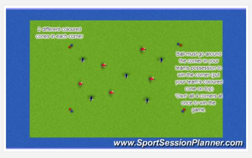 Use a space approx 30m x 30m with pair of cones (2 different colours) in each corner.