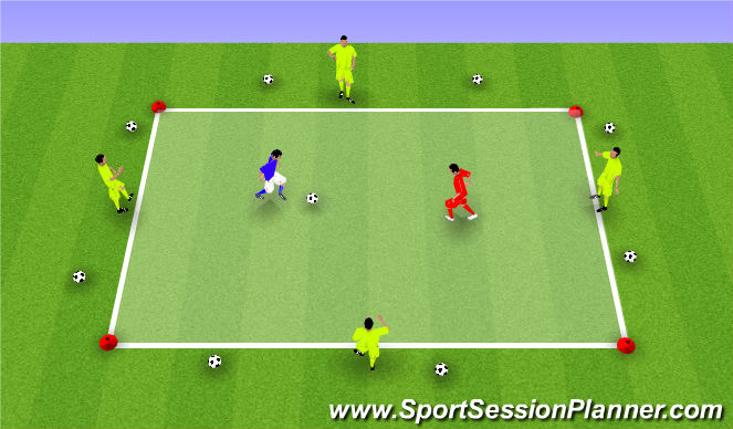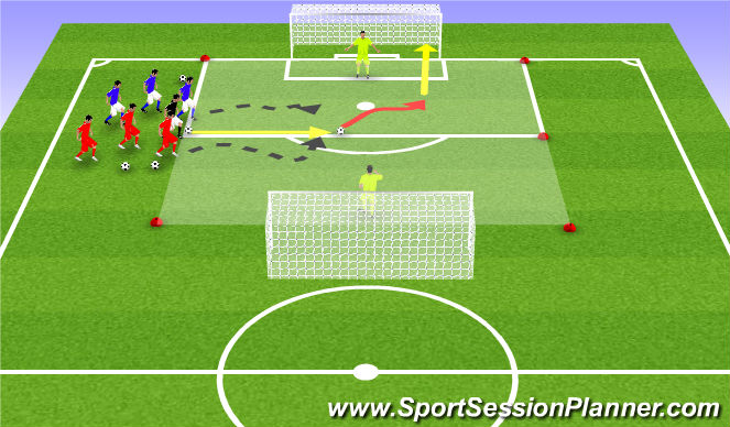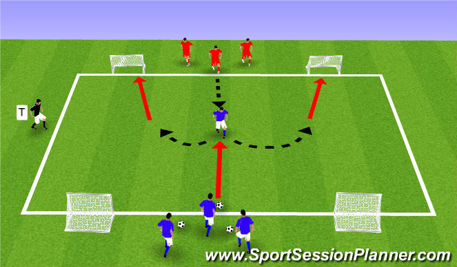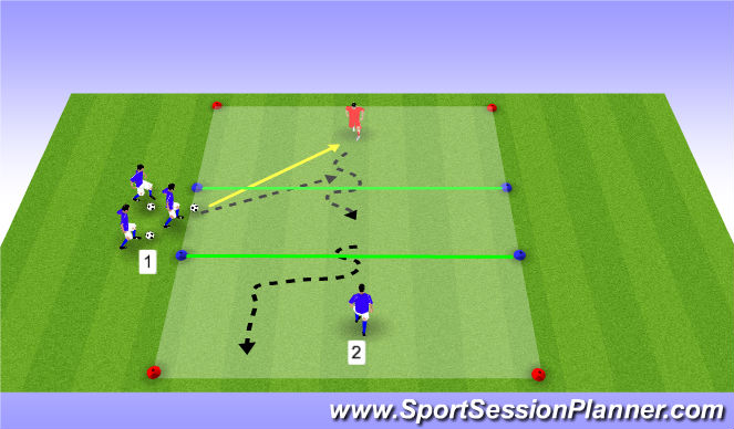De aanvaller wordt ingespeeld en probeert weg te draaien bij tegenstander, hij kan scoren op 1 van de 2 doeltjes. De verdedediger komt pas t veld in wanneer de aanvaller wordt ingespeeld. Wanneer de verdediger onderschept kan hij scoren op de twee andere doeltjes.