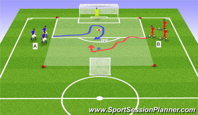 B (aanvallers) dribbelt in en kiest 1 pilon, A moet dan om andere pilon. Je krijgt dan frontale 1:1