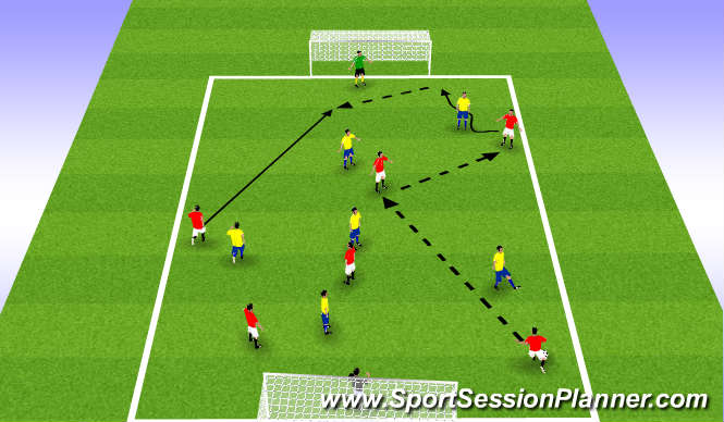 organization: Two teams of 6 players and a Goalkeeper. Size and shape of the pitch depending on age, level and aims. (30x30 / 40x30)