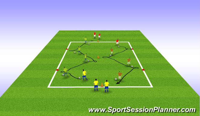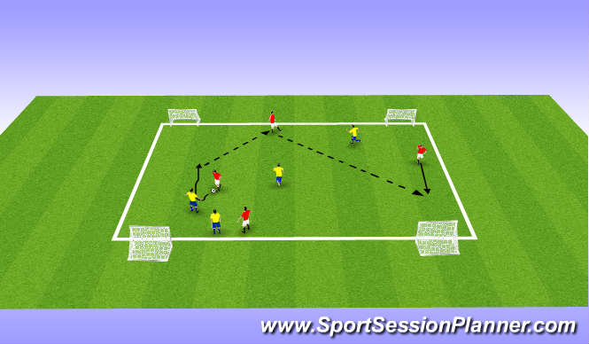 Instruction: Team on the ball must try to create scoring opportunities in one of the 2 small goals that the other team defend. They must try to change the angle of attack by using spin off moves and switches of play.