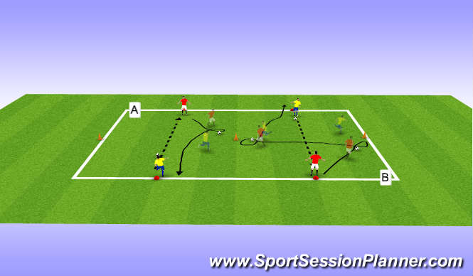 Progression/variation: B - Challenge the players to dribble to both cones to make to spin off moves. after the first spin off, the defender tracks the player on the ball who makes another spin off move to then accelerate away.