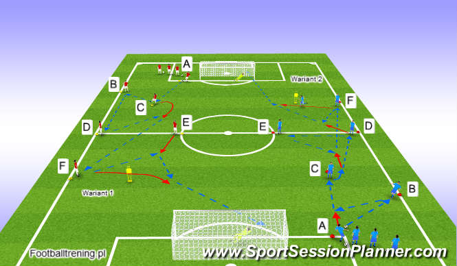 Wariant 2; Zawodnik A wymienia podanie z ustawionym przy linii bocznej boiska partnerem B, a następnie podaje prostopadle do stojącego na wprost zawodnika C. Po przyjęciu piłki z półobrotem rozpoczyna wymianę podaniową w trójkącie wspólnie z partnerami D i E, a następnie podaniem skośnym ponownie zagrywa piłkę do bocznej strefy do ustawionego przy linii bocznej boiska zawodnika F. Po zwolnieniu strefy z wymianą podania z partnerem D kończy on ćwiczenie oddaniem strzału na bramkę.