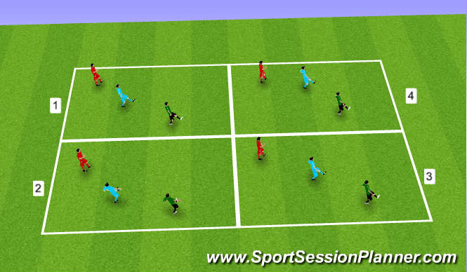 2. Leading to passing through the suares 1 -- 4 in all squares. e.g. R & B v G. one complete cycles = 1 goal e.g. squares 1--4 then B & G v R etc.