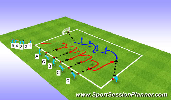 AFTER THEY GO ROUND THE LAST CONE THEY MAKE A RUN FOR D TO PASS A THROUGH BALL ,PLAYERS THEN DRIBBLE BALL ROUND MANNEQUIN AND SHOOT INTO THE GOALS (TRY AND HIT CONE AT BACK POST.