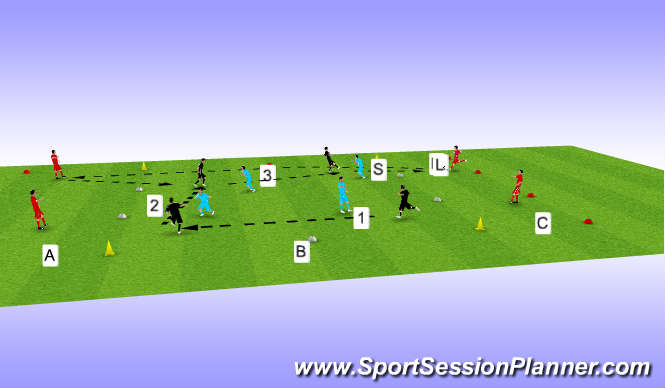 3, PLAYER 1 PASSES TO CONE B AND TURNS MAKING A RUN TOWARDS GOAL (KEEPING ONSIDE)