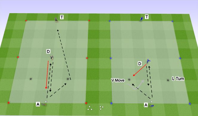 Attacker (A) plays double pass with Defender (D). Defender then applies pressure. A looks to break defensive line with 1st touch and then play forwards into Target (T) on the opposite side. Activity then begins again from opposite side.