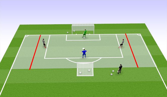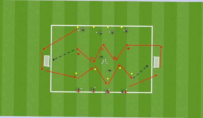 4 cones set equidistant along outer edge of zone numbered 1 through 4 (Red one side Yellow the other) with a goal set at centre of each end line for players to work around and shoot at.