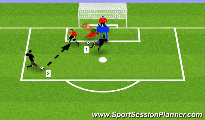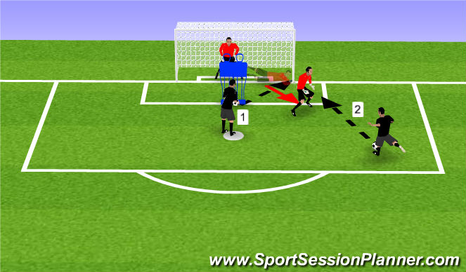 El portero está situado detrás de dos muñecos que le impiden una buena visibilidad. El EP puede decidir si salir por un lado u otro debiendo el portero lanzarse sobre el balón para achicar el espacio. Una vez acabada esta acción debe reubicarse para reaccionar ante un tiro escorado que recibirá desde el mismo lado donde ha realizado la acción anterior.