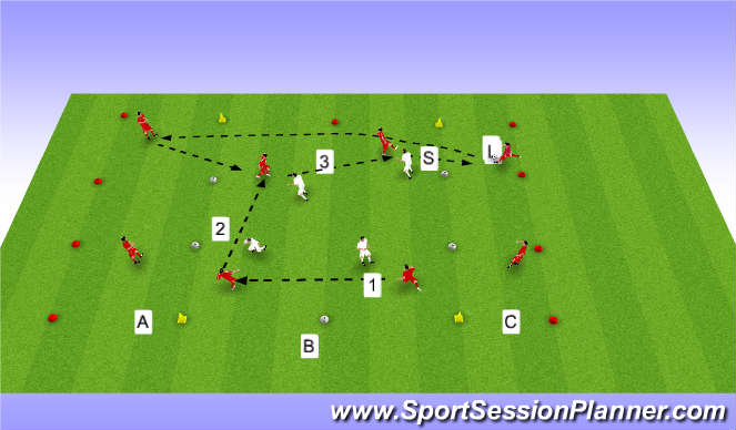 Mark out pitch into two outside 10yds (A+C) areas and a central 20yds (B).