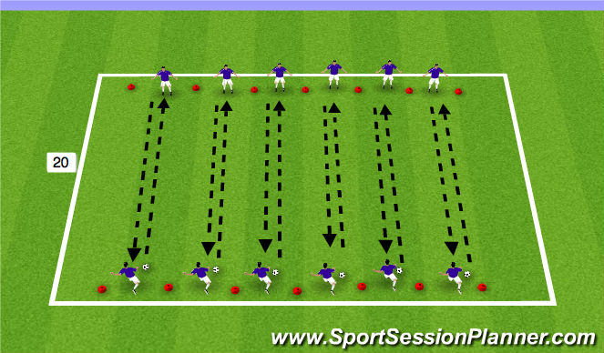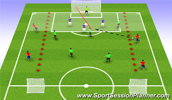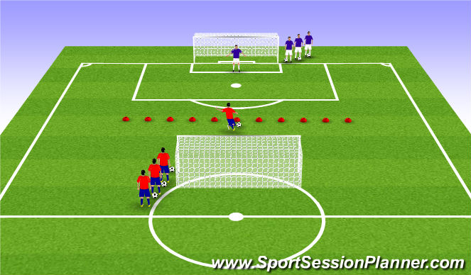 Coaching Points: Dribble lace chop/quickly, Head down & over the ball when finishing, positive 1st touch on to shooting foot, crossers look to connect & wrap foot around the ball to get ball between 6 & pk mark