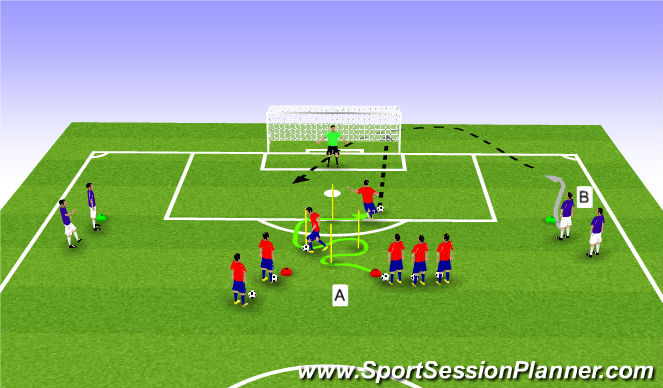(A) Attacking players dribble through poles & finish. Switch lines & rotate R ft/L ft shots. (7 min)