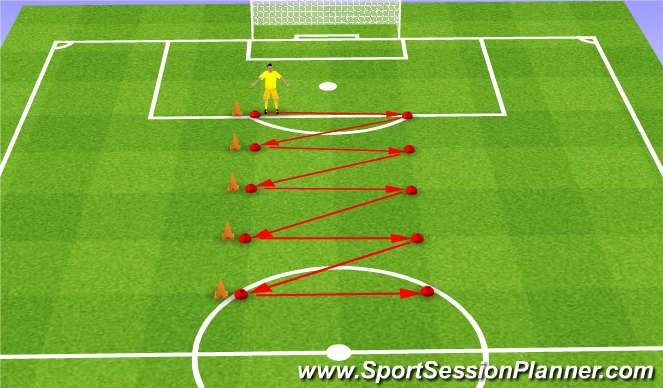 1) Goalkeeper uses different footwork as instructed by coach, through cones and into the goal: