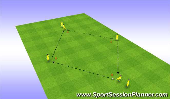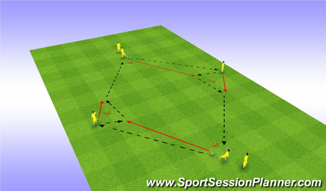 Receive ball behind cone and transfer to other side of cone with first touch ready to pass