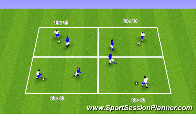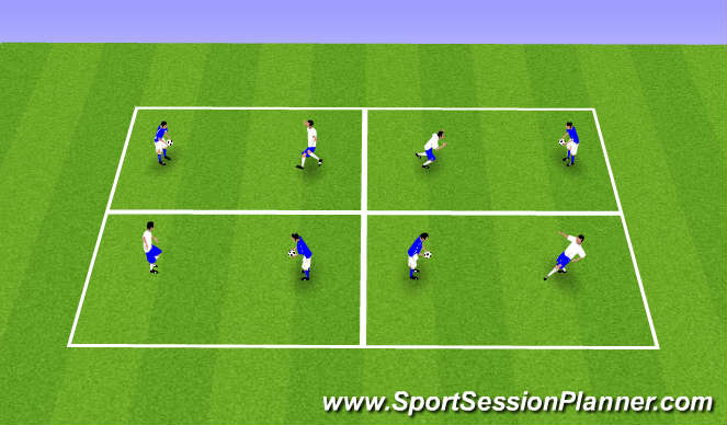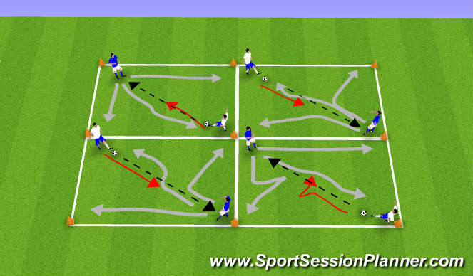 - Player on the ball must dribble around the grid while keeping the ball away from opponent.