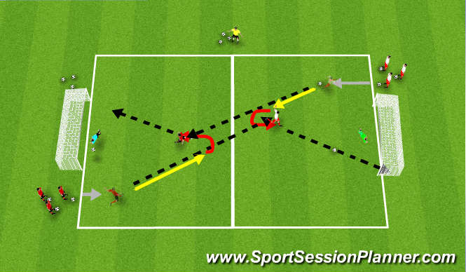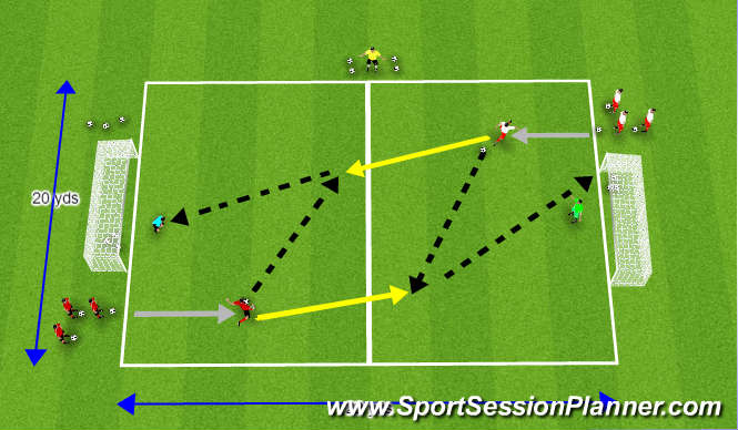 Starting Point: Players to the side of the goal dribble the ball a few yards and then play a diagonal pass across to the other player who is doing the exact action from their side.