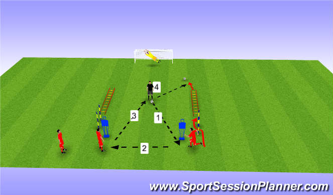 Coach passes ball to player 1, he then plays a 1 touch pass to player 2 who then plays one touch to coach, once player 1 passes, he goes around mannequin, through poles, quick feet through ladder and then shoots..