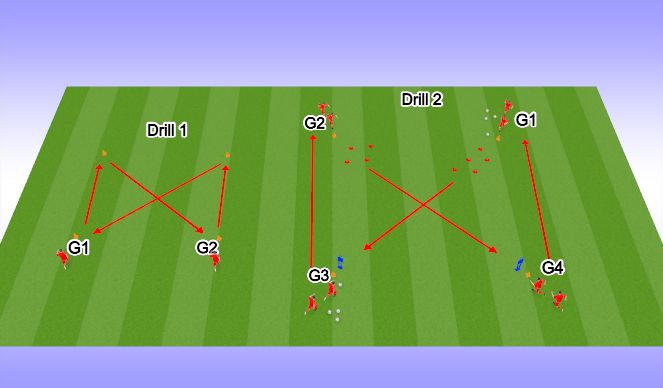 G1 & G2 start together. They both follow the same pattern (forward then a diagonal run back to the opposites starting position). On the diagonal both groups cross over in a one-for-one formation. This begins to stimulate mental focus in each player as they need to concentrate on correct timing. The forward component will vary in preparation exercises, with the diagonal run only changing in intensity.
