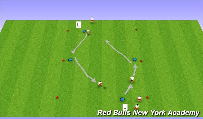 - Players dibble given blue cones