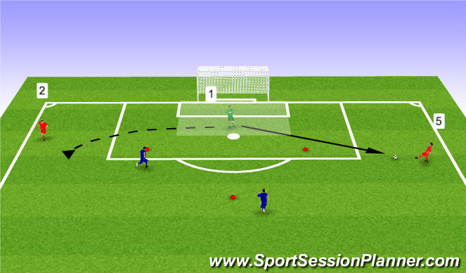 INSTRUCTIONS: GK will use feet to play a variation of passes to CB and OB's who will be mobile and extend range with every possession. Pressure added when striker is placed beyond the dirken (Red) cone.