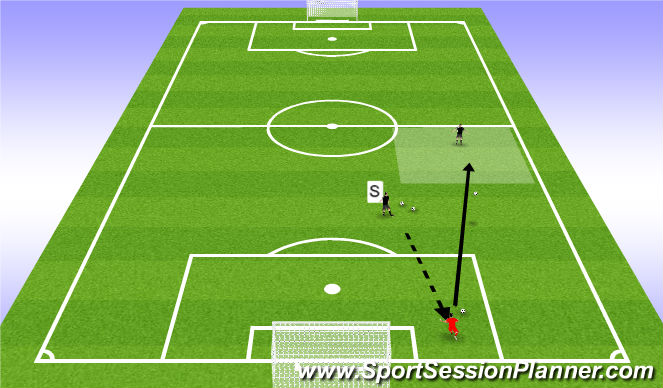 INSTRUCTIONS: GK will recieve backpass and play ball to target for 1 time clearances. Add pressure by having defender sprint from the same distance of where S and Ball is. S moves in different areas of defensive 3rd and lays offf pass to GK.