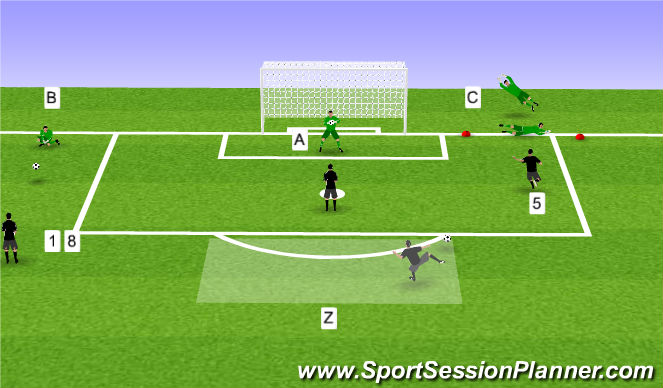 INSTRUCTION: GK warmps up handling and footwork while incorporating angle play and different distances.
