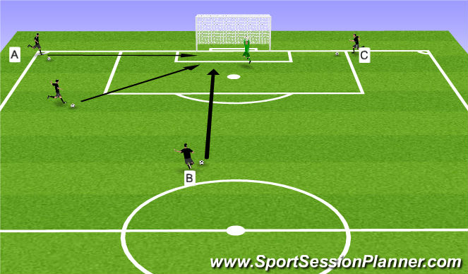 INSTRUCTIONS: GK faces 6 shots from 12-18 yards at B angle. GK starts off at center of ark then uses footwork to positions herself balline in order to deal with a shot from S. after the first save the GK will then immedietly get up and get set. Add small cones to make gk cover corner.