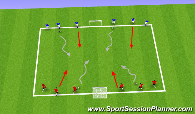 Divide into two teams, each teams has two balls, when coach starts the game, both teams enter the pitch, each team has two balls to attack with but must also defend two balls, the game continues until all four balls have left the pitch.