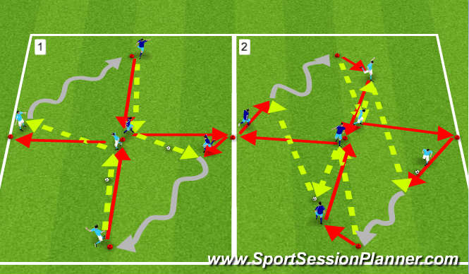 Coaching Points: Qualities of a good pass, taking a good first touch that leads the player to their target, timing runs, checking shoulder, awareness of next pass coming in.