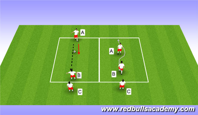 Player A runs to the middle and becomes a dummy defender. Player B dribbles at player A and does a move around the player and dribbles to the other side.