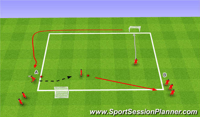 Two players should be on the field ready, one to receive the throw and one in open space.. The first player on the outside throws the ball to the player on the field. The player on the field receives the ball and passes to their team mate. Their team mate can then score a goal. The player who receives the throw joins line B and the shooter joins line A.