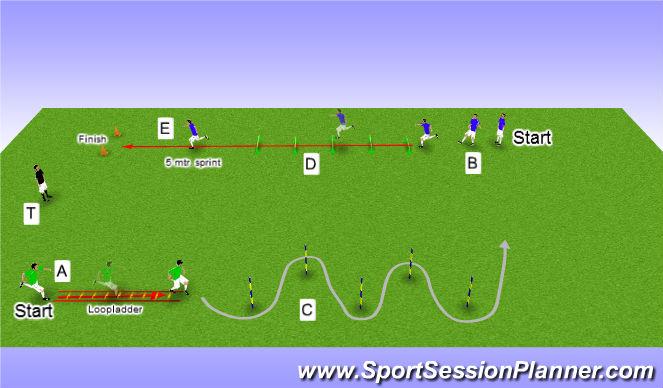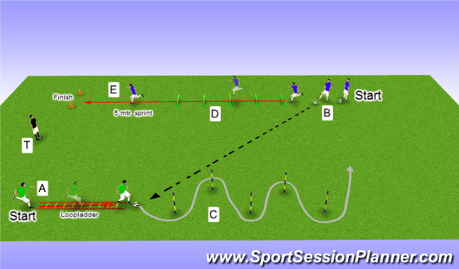 Speler A gaat via loopladder zo snel als hij/zij kan naar C en slalomt tussen de palen door en sluit aan bij B