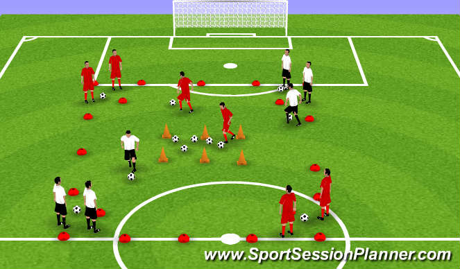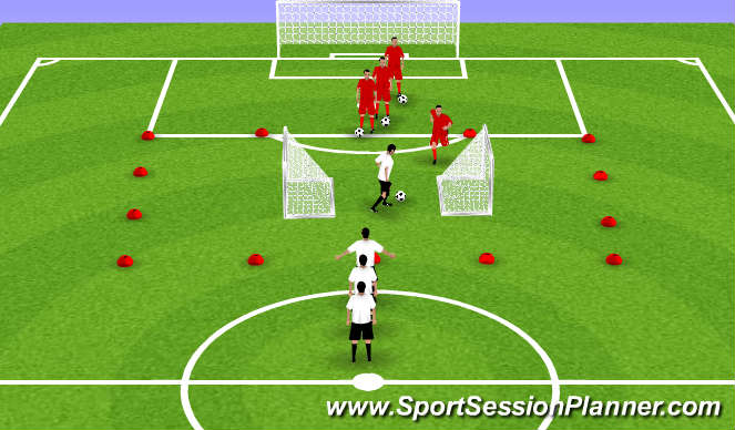 Whites pass the ball across to reds whose aim is to simply score through either goal targets which are in front of him. The whites aim is to prevent a goal being scored and if wins possession of the football scores by dribbling over players line.